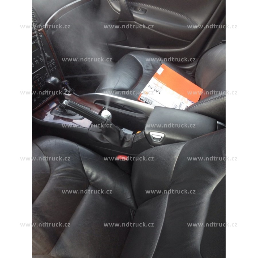 4. Umístěte nádobku do prostoru pro nohy a aktivujte hlavu spreje. Během aplikace (přibl. 2 minuty) nechte dveře a okna zavřené. Ujistěte se, že částice vycházející ze spreje (90–150 cm) nedosahují na ovládací prvky osvětlení a střešního okna, displej, rádio, navigaci atd.