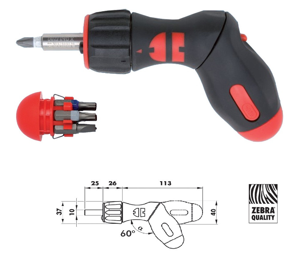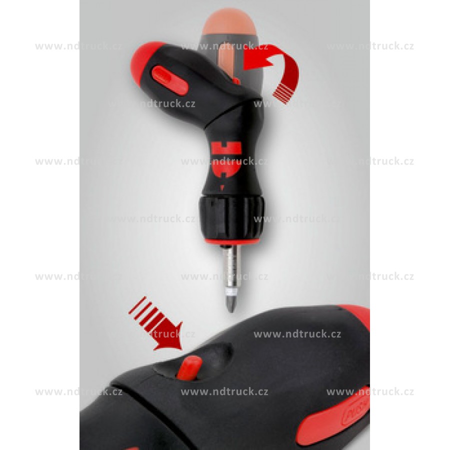 - Díky přestavitelné rukojeti lze použít jako běžný šroubovák v přímé poloze nebo jako pistolový šroubovák v úhlu 60°