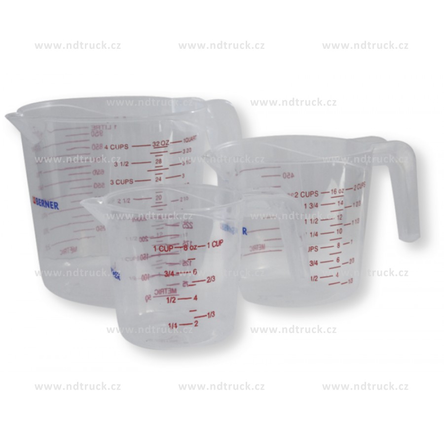 Sada se skládá z 3 odměrných nádob s objemy 250 ml, 500 ml a 1000 ml